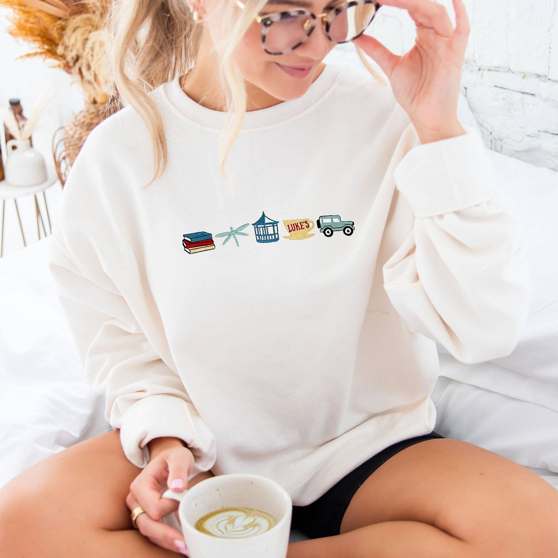 Snuggle up in Stars Hollow style with our Gilmore Girls Icons Embroidered Gemma Crewneck Sweatshirt! Perfect for fans of the iconic show, this cozy autumn crew features embroidered icons of beloved Gilmore Girls symbols, including Luke's Coffee. Size Up for the coziest fit and enjoy wearing this while watching the show this fall!
